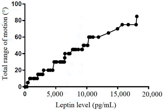 The correlation between total range of motion and leptin level in subacromial fluid (Pearson R: 0.50 (0.52~0.84), R2 = 0.53, and p < 0.001).