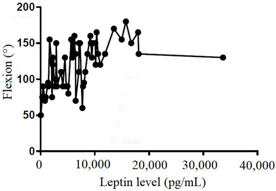 The correlation between flexion and leptin level in subacromial fluid (Pearson R: 0.50 (0.28~0.68), R2 = 0.25, and p < 0.001).