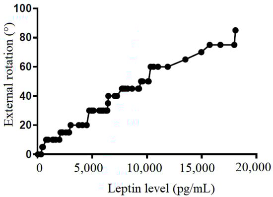 The correlation between external rotation and leptin level in subacromial fluid (Pearson R: 0.99 (0.98~0.99), R2 = 0.97, and p < 0.001).