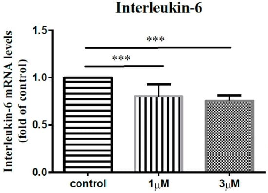 The mRNA expression levels of interleukin-6 of the subacromial bursa cells treated with different concentrations of leptin. (***: p < 0.001 by post-hoc analysis).
