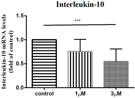 The mRNA expression levels of interleukin-10 of the subacromial bursa cells treated with different concentrations of leptin. (***: p < 0.001 by post-hoc analysis).