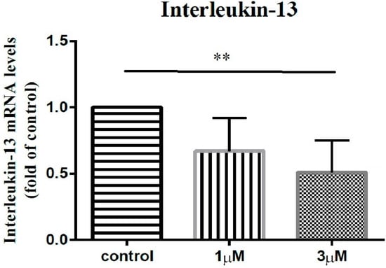 The mRNA expression levels of interleukin-13 of the subacromial bursa cells treated with different concentrations of leptin. (**: 0.010 > p > 0.001 by post-hoc analysis).