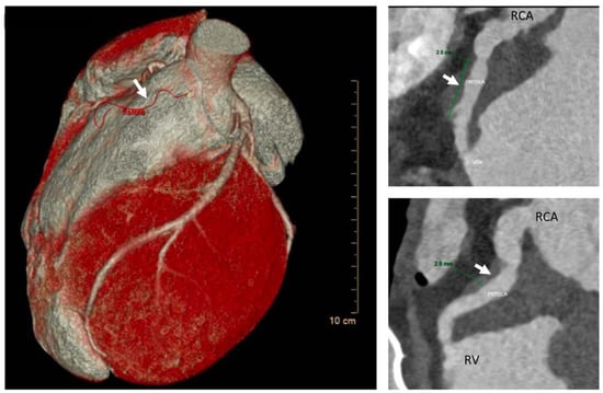 AngioTC and volume rendering image: Infundibular branch of large caliber originating from CDX; after an intramyocardial course involving the proximal tract (length 2 cm and depth 3 mm) to the middle tract, it fistulizes with the right ventricular outflow tract. White arrow is pointing at the fistula RCA = right coronary artery.