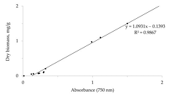 Calibration curve of adsorption at 750 nm versus V. punctata biomass (mg/g).