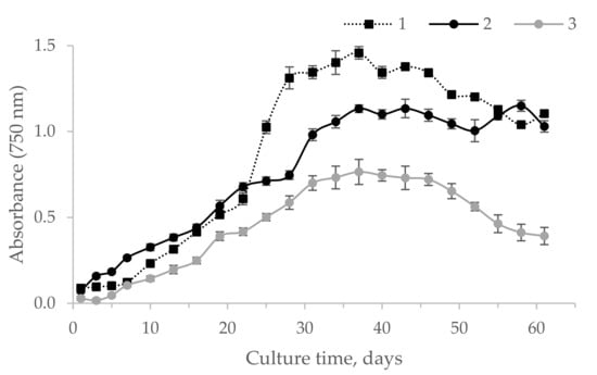 Growth curve of V. punctata on different nutrient media (n = 3): 1—BBM 3N; 2—Prat; 3—PratM.