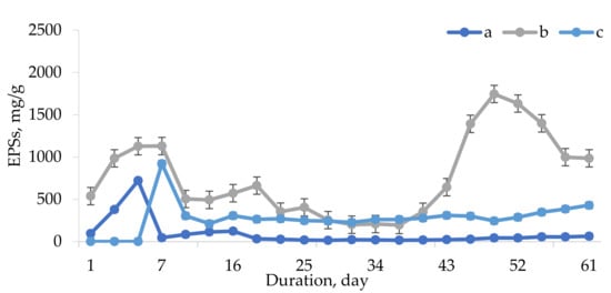 Curve of EPS production (mg/g d.w.) by microalga V. punctata during cultivation on different nutrient media (n = 3): a—BBM 3N; b—Prat; c—PratM.