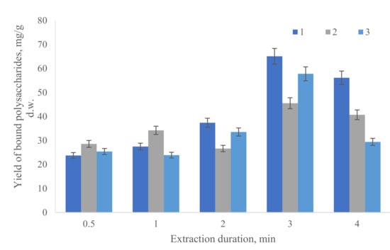 Yield dynamics of bound polysaccharides depending on the sonication power: 1–20 w; 2–40 w; 3–60 w. All values in a figure do not differ significantly from the rest (p > 0.05). Average values are presented (n = 3).