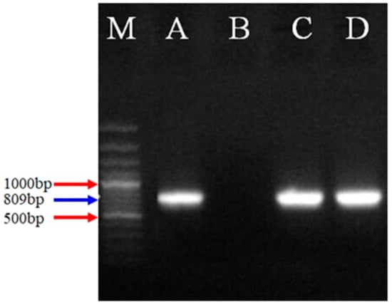 Figure 1. Ethidium bromide-stained agarose gel: Lane M with 100 bp DNA, Lane A possessing a positive control for the organism, Lane B with negative control (devoid of DNA), and Lane C and D indicate positive E. crandallis isolates with product size 809 bp (small subunit ribosomal RNA fragment).