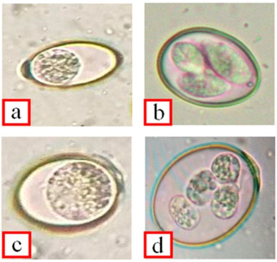 The sporulated oocysts were examined at 400× magnification under a light microscope (Olympus, Tokyo, Japan) coupled with a digital camera. Fifty oocysts from each sample were randomly selected to observe their morphological characteristics. Identification was performed based on shape and size, the presence of micropyle, and polar caps [23].