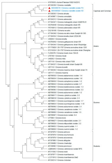 Figure 3. Small subunit 18S rRNA gene-based phylogenetic analysis of Eimeria isolates originated from caprine, bovine, avian, and rodents. The evolutionary tree was generated with MEGA X software using the neighbor-joining method with a reliability of 1000 bootstrap intervals. Red triangles revealed current isolates (Eimeria crandallis).