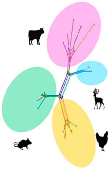 Figure 5. Evolutionary network based on the Neighbour-net, including sequences of Eimeria, (purple, blue, green, and orange circles indicating a clade representing Eimeria sequences of the specific host). The Splits Tree software was employed to generate the evolutionary network based on an uncorrected p-distance, using the Kimura 2-parameter substitution model.