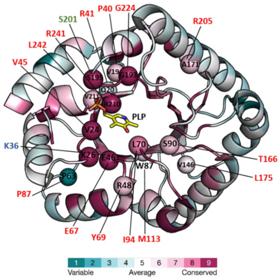 Structure of PipY from S. elongatus (PDB 5NM8) colored for the evolutionary conservation of residues among PLPBP homologs, and mapping therein, residues targeted by missense mutations. The structure is in a cartoon representation except for the PLP, which is in a stick representation with C, O, N, and P atoms in yellow, red, blue, and orange, respectively. Color-coding of the structure from cyan to magenta according to the residue conservation score (the higher, the more conserved) given by The ConSurf Server “URL https://consurf.tau.ac.il/consurf_index.php (accesed on 3 August 2022) when queried with chain A of the PDB 5NM8, with default parameters. Spheres mark the location in PipY of known human PLPHP mutations (see Table 2). Residue numbers are given in one letter code, in black for S. elongatus, and shown in red, green, and blue, the human mutations causing vitamin B6-dependent epilepsy, and the in vitro mutations obtained in the corresponding proteins of F. nucleatum, and E. coli, respectively.