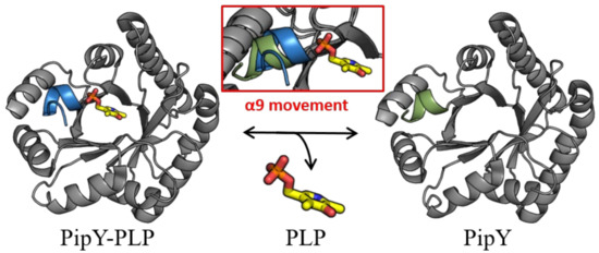 While PLP is found in PLPBP structures in the same location that it is found in the fold type III of PLP enzymes, in all PLPBP structures the PLP cofactor is solvent-exposed and highly accessible, thus being appropriately positioned for a role of PLPBP as a PLP delivering device in cells. In this context, the role of the C-terminal α helix (helix 9) of PipY in anchoring the phosphate of PLP, and the relatively large changes in helix 9 orientation depending on the presence or absence of PLP have led to the hypothesizing [22] that this helix may have a role in being a trigger for the binding and release of PLP (Figure 2).