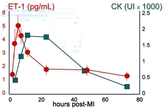 Endothelin-1 (ET-1) plasma levels (red) increase sharply shortly after acute coronary occlusion; creatine kinase (CK) levels shown (green) for comparison. Reprinted with permission from ref. [12]. Copyright 1991, American College of Cardiology Foundation, Published by Elsevier Inc.