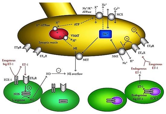 Non-exocytotic norepinephrine release in myocardial sympathetic nerve varicosities is enhanced by the activation of ETA receptors via the stimulation of the neuronal Na+/H+ exchanger. Na+ influx in exchange for H+ leads to an accumulation of axoplasmic Na+, which, in turn, triggers excessive axoplasmic norepinephrine release via the norepinephrine transporter functioning in reverse mode (i.e., transporting norepinephrine from the intracellular to extracellular space). By contrast, ETB receptors decrease norepinephrine overflow, possibly by enhancing nitric oxide production via nitric oxide synthase [21]. Such opposing effects of endothelin receptors on sympathetic nerve endings during myocardial ischemia were elegantly demonstrated in the ex vivo experimental setting [26], with the role of ETB receptors assessed by means of pharmacological blockade and with the use of the subtraction model of ETB-deficient rats (Figure 4).