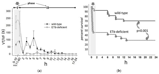 (a) ETB-deficient rats displayed higher incidence of early-phase (phase I) ventricular tachyarrhythmias (VTs) (arrow); (b) As a result, there was excessive mortality during this period (arrow), strongly suggesting a prominent role of functioning ETB receptors. Reprinted with permission from ref. [29]. Copyright 2009, Springer-Verlag.