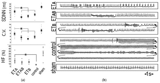 (a) In rats, intracerebroventricular ETA-receptor blockade improved autonomic (sympathetic and vagal) indices, i.e., the standard deviation of successive RR-intervals (SDNN), the coefficient of variance (C.V.), and the high frequency (HF) component of heart rate variability (* denote significant differences) (b) Examples of telemetry recordings displaying lower arrhythmogenesis after intracerebroventricular ETA-receptor blockade. Reprinted with permission from ref. [44]. Copyright 2019 Elsevier Inc.