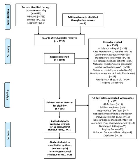 From 4173 articles, we reviewed 206 full-text articles. In total, we included 71 studies (63 observational, 8 PSM/RCTs) detailing 4280 adult patients that reported on the use of microaxial LVADs in CS (Figure 1) [,,,,,,,,,,,,,,,,,,,,,,,,,,,,,,,,,,,,,,,,,,,,,,,,,,,,,,,,,,,,,,,,,,,,,]. The findings of the one-armed observational studies and the findings of the PSM/RCTs are reported separately. Of the observational studies, 34 were reported by centers from Europe, 25 from North America, 3 from Asia and 1 from South America, whereas all of the RCTs and PSMs were reported by centers from Europe. Percutaneously inserted devices were more commonly used than surgically inserted devices.