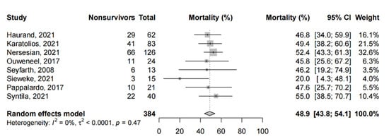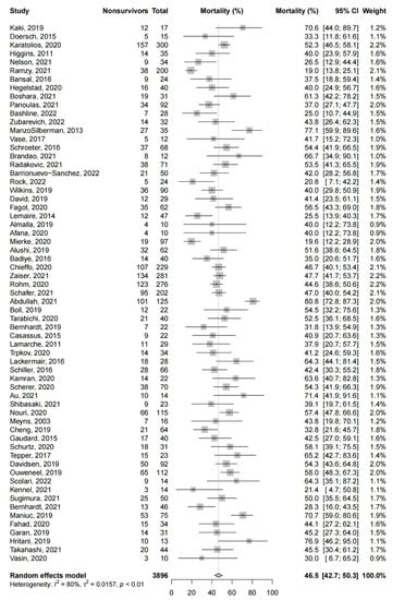 Amongst the observational studies (63 studies, 3896 patients), the pooled short-term mortality was 46.5% (95%-CI: 42.7% to 50.3%, Figure 2). As all studies had a JBI score of ≥7, sensitivity analysis excluding studies with higher risks of bias was not possible. We excluded studies with a JBI score of <10 as an exploratory analysis, and this yielded similar pooled estimates for the short-term mortality (44.7%, 95%-CI: 40.2% to 49.2%).