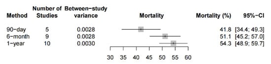 The pooled 90-day, 6-month and 1-year mortality was 41.8% (95%-CI: 34.4% to 49.3%, 5 studies, 448 patients), 51.1% (95%-CI: 45.2% to 57.0%, 9 studies, 676 patients) and 54.3% (95%-CI: 48.9% to 59.7%, 10 studies, 881 patients), respectively, amongst the observational studies (Figure 4). Two PSM studies reported a mortality at the 6-month follow up that ranged between 36.6% (12/33) and 75% (45/60) [,]. One PSM study reported a 1-year mortality rate of 60%.