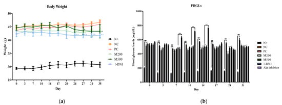 Throughout the experiment, the body weights of all the experimental mice were monitored twice a week (Figure 1a). Although there was no significant difference in the first week of treatment, the weights of the db/db mice treated with MLE or 1-DNJ started to reduce significantly compared to the NC group from the 24th day of treatment. At the end of the administration, the body weights of the MLE- or 1-DNJ-treated groups had significantly decreased compared to the NC group. Furthermore, the initial fasting blood glucose levels in all the db/db mice were higher than those of the db/m mice, and the N+ group was stable and unchanged (Figure 1b). The fasting blood-glucose-lowering effects of MLE or 1-DNJ were comparable to that of metformin. The results indicate that dietary MLE or 1-DNJ can reduce the body weight and FBGLs of diabetic mice.