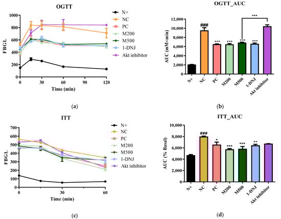 Effects of MLE or 1-DNJ on the parameters of glucose tolerance and insulin tolerance in diabetic db/db mice. (a) OGTT. (b) AUC of OGTT. (c) ITT. (d) AUC of ITT. N+, db/m + saline; NC, db/db + saline; PC, db/db + metformin 200 mg/kg/day; M200, db/db + MLE 200 mg/kg/day; M500, db/db + MLE 500 mg/kg/day; 1-DNJ, db/db + 1-DNJ 40 mM/kg/day; Akt inhibitor, db/db + MLE 500 mg/kg/day + Akt inhibitor 30 mM/kg/day. Values are expressed as mean ± SE. ### p < 0.001 vs. N+; * p < 0.05, ** p < 0.01, *** p < 0.001 vs. NC.