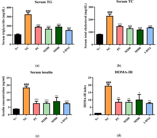 Compared to the N+ group, the serum TG and TC levels in the NC group markedly increased. After 35 days of treatment, the serum TG and TC levels in the MLE or 1-DNJ groups decreased compared with the NC group (Figure 3a,b). Hyperinsulinemia is a well-known feature of T2DM [2]. A high serum insulin concentration was observed in the NC group compared with the N+ group, which was reversed after the administration of MLE or 1-DNJ (Figure 3c). Consistent with the changes in the serum insulin concentration, MLE or 1-DNJ supplementation significantly decreased the HOMA-IR index (Figure 3d).
