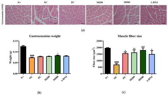 H&E staining showed skeletal muscle fiber deformation and cell disorders in the NC group compared with the N+ group, whereas the supplementation with MLE or 1-DNJ partially improved the pathological changes of IR (Figure 4a). As shown in Figure 4b, the weight of the gastrocnemius muscle in all the db/db mice remarkably decreased compared with the N+ group, and there was no significant difference between the treatment groups, but the M500 group showed an increase compared to the NC group. Furthermore, the muscle fiber size in the NC group was significantly reduced compared with the N+ group, whereas the supplementation with MLE or 1-DNJ significantly increased the muscle fiber diameter (Figure 4c).