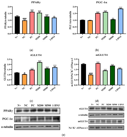 Effects of MLE or 1-DNJ on glucose metabolism of diabetic skeletal muscle. (a) PPARγ. (b) PGC-1α. (c) tGLUT4. (d) mGLUT4. (e) Western blot analysis for PPARγ, PGC-1α, tGLUT4, and mGLUT4 protein expression in diabetic skeletal muscle. N+, db/m + saline; NC, db/db + saline; PC, db/db + metformin 200 mg/kg/day; M200, db/db + MLE 200 mg/kg/day; M500, db/db + MLE 500 mg/kg/day; 1-DNJ, db/db + 1-DNJ 40 mM/kg/day. Values are expressed as mean ± SE. # p < 0.05, ### p < 0.001 vs. N+; * p < 0.05, ** p < 0.01, *** p < 0.001 vs. NC.