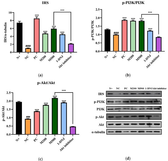 Effects of MLE or 1-DNJ on IRS-1/PI3K/Akt insulin signaling pathway of diabetic skeletal muscle. (a) IRS-1. (b) p-PI3K/PI3K. (c) p-Akt/Akt. (d) Western blot analysis for IRS-1, p-PI3K, PI3K, p-Akt, and Akt protein expression in diabetic skeletal muscle. N+, db/m + saline; NC, db/db + saline; PC, db/db + metformin 200 mg/kg/day; M200, db/db + MLE 200 mg/kg/day; M500, db/db + MLE 500 mg/kg/day; 1-DNJ, db/db + 1-DNJ 40 mM/kg/day; Akt inhibitor, db/db + MLE 500 mg/kg/day + Akt inhibitor 30 mM/kg/day. Values are expressed as mean ± SE. ### p < 0.001 vs. N+; *** p < 0.001 vs. NC.