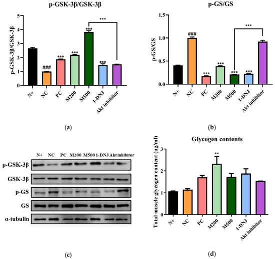 The expression level of p-GSK-3β was significantly lowered in the NC and Akt inhibitor groups, whereas MLE or 1-DNJ supplementation elevated the level of p-GSK-3β (Figure 7a). Compared with the N+ group, the expression levels of p-GS dramatically increased in the NC and Akt inhibitor group, but MLE or 1-DNJ supplementation reduced the GS phosphorylation (Figure 7b). Accordingly, the muscle glycogen content in the MLE- or 1-DNJ- treated groups increased, as compared with the NC group (Figure 7d). These findings indicate that MLE or 1-DNJ supplementation may regulate the expressions of GSK-3β and GS proteins, leading to the up-regulation of glycogen content in diabetic skeletal muscle.