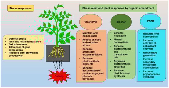 To reduce excess soil salinity, plant scientists are employing techniques such as sub-soiling, mixing sand, seed bed preparation, and salt scraping, as well as modern agronomic practices, hydrophilic polymer, gypsum, sulfur acids, green manuring, humic substance, farm yard manures, irrigation system, and salt-tolerant crops [19,20,21,22]. Recently, different organic amendments such as the application of vermi-compost (VC), vermi-wash (VW), biochar (BC), plant growth promoting rhizobacteria (PGPR), and bio-fertilizers (BF) are being used widely to ameliorate the negative consequences of soil salinity [5,6,23,24,25,26]. For instance, VC enhances morphological traits, chlorophyll content, antioxidant enzyme activities, and improves salinity tolerance of maize plants [27]. Several studies showed that BF and BC enhance plant growth progressions under salinity stress by improving antioxidant enzyme activities, and reduces oxidative damage in different plants [5,28,29]. In addition, the inoculation of PGPR under salt stress accelerates microbial population and gene expression in the rhizosphere, boosts biomass production and enhances the salt tolerance of different plants [6,30,31]. The organic amendments mitigate salt stress via a wide range of mechanisms, including the regulation of ionic homeostasis, antioxidant enzyme activities, and the reduction of oxidative damage. Several studies described that PGPR and BC relieved the negative effects of salinity by increasing the photosynthetic rate, antioxidant enzyme functions, secondary metabolites accumulation, and decreasing ROS in plants [6,32,33,34]. Organic amendments such as VC and VW include a variety of plant growth-regulating components such as micro and macro elements, vitamins, enzymes, and hormones that have been shown to reduce the harmful effects of salts on plants [25]. Furthermore, several studies have stated that VC and VW have been shown to reduce soil salinity through the enhancement of antioxidant enzymes and to lessen electrolyte leakage and oxidative stress [35,36]. Similar to other organic supplements, BF has been shown to attain a better environment through fixing atmospheric nitrogen, phosphate and potassium solubilization or mineralization, releasing o plant growth regulating materials, producing antibiotics, and degrading organic matter in the soil, all of which contribute to increased plant salinity stress tolerance [37,38,39].