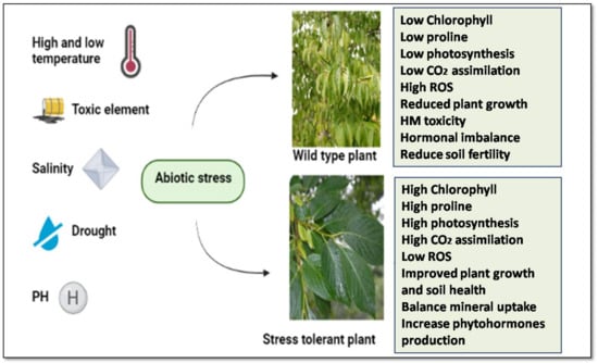 Stress is defined as a stimulus that inhibits the growth of plants and their metabolism and development at the time of both abiotic and biotic stress [1]. Abiotic stresses, such as higher or insufficient water supply, low and high temperature, heavy metals, ultraviolet radiation and salinity, are damaging to plant development and growth, and cause considerable losses in agricultural productivity worldwide [2,3]. When the stress threshold is exceeded, the plant is stressed, followed by activation of physiological, biochemical, morphological, and molecular-level mechanisms. The activation of these mechanisms can show the development of a fresh physiological state and the restoration of homeostasis in plants [4]. Due to abiotic stress, it has been estimated that crop production yield decreases by up to 70% in several commercially significant crops and they execute at just 30% of their genetic makeup in terms of yield [5].