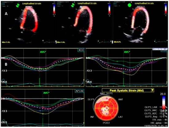 Two–dimensional speckle–tracking echocardiography at the level of the left ventricle. (A) Longitudinal analysis of deformation in apical 2-, 3-, and 4 chamber views; (B) bull’s eye map.