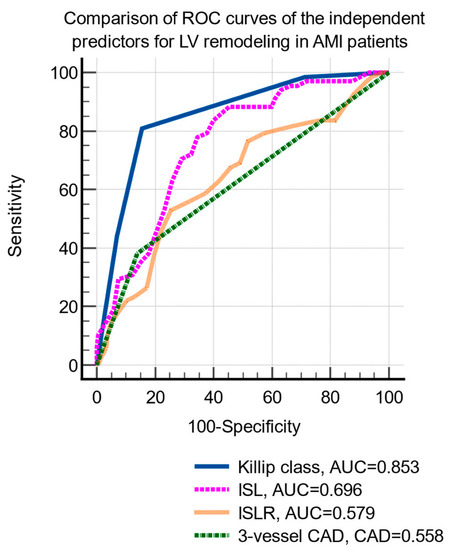 LV remodeling was significantly associated with age, hypertension, hypercholesterolemia, smoking status, Killip class, peak creatin-kinase MB level, two- and three-vessel coronary artery disease, and infarct-related longitudinal strain and strain rate (Table 3). The multivariate logistic regression identified the following independent predictors of LV remodeling: Killip class, three-vessel coronary artery disease, infarct-related strain, and strain rate (Table 4). The comparison of the ROC curves of the independent prediction of LV remodeling is shown in Figure 2.