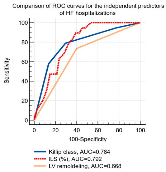 The ROC curve analysis established the following cutoff levels for the independent predictors of HF hospitalizations: Killip class >2 (sensitivity 78.9%, specificity 70.5%, p < 0.001) and infarct-related longitudinal strain ≤−12.5% (sensitivity 90%, specificity 61%, p < 0.001), the presence of LV remodeling (sensitivity 73.7%, specificity 60%, p < 0.01), Figure 3.