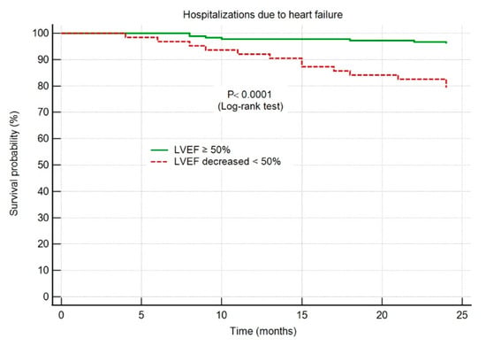 The HF hospitalization-free survival probability was significantly higher in group I patients, with an LVEF maintained ≥50% throughout the 2-year follow-up period, as shown in Figure 4.