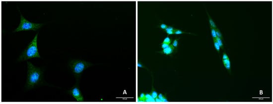 To evaluate the cell viability after the different treatments (48 h), MTT assay and neutral red (NR) assay were carried out as previously described []. Briefly, for the MTT assay, MTT (0.5 mg/mL in PBS) was added to the cells (100 µL) and the plate was incubated for 3 h (37 °C). Then, this reagent was removed and DMSO was added to the cells (100 µL). The 570 nm absorbance values were obtained from the automated microplate reader (Tecan Infinite M200, Zurich, Switzerland). For the NR assay, NR medium (1:100 in DMEM) was added to each well (100 µL) and the plate was incubated for 3 h (37 °C). After that, the cells were washed in PBS and NR destain solution (50% of 96% ethanol, 49% deionized water, and 1% glacial acetic acid) was added to the cells (150 µL). The 540 nm absorbance values were obtained in the automated microplate reader.