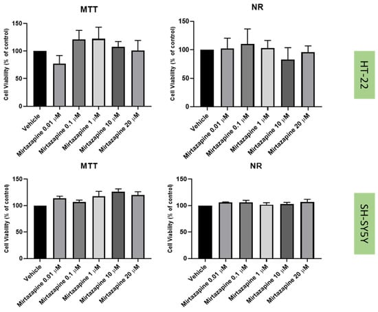 HT-22 and SH-SY5Y viability after incubation of mirtazapine (0.01 µM–20 µM) for 48 h, obtained by MTT (left) and NR (right) assays. The results represent the mean ± SEM of 3 independent assays. For SH-SY5Y, these results were previously developed by our Research Group [].