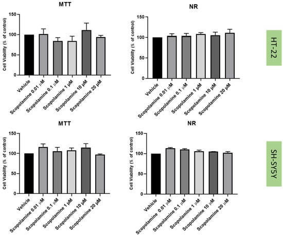 HT-22 and SH-SY5Y viability after incubation of scopolamine (0.01 µM–20 µM) for 48 h, obtained by MTT (left) and NR (right) assays. The results represent the mean ± SEM of 3 independent assays.