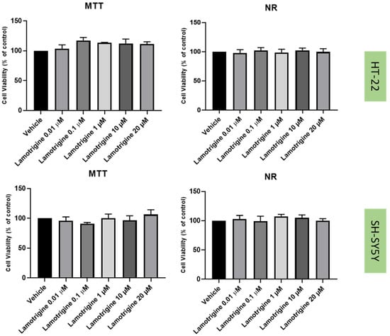 HT-22 and SH-SY5Y viability after incubation of lamotrigine (0.01 µM–20 µM) for 48 h, obtained by MTT (left) and NR (right) assays. The results represent the mean ± SEM of 3 independent assays.