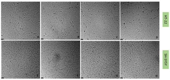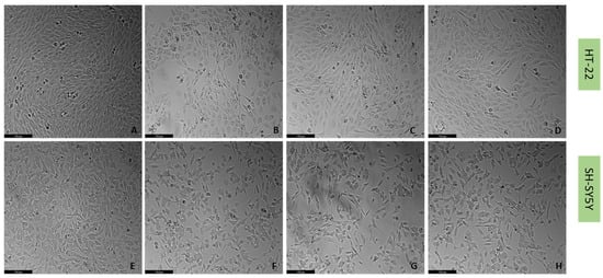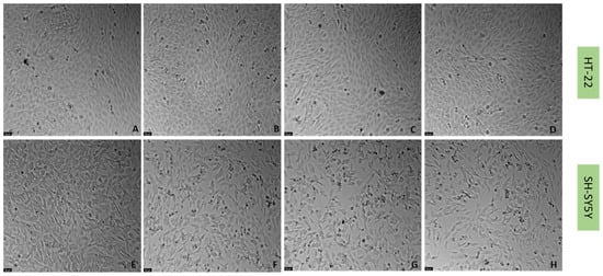 HT-22 and SH-SY5Y morphology after 48 h-incubation of (A,E) vehicle, (B,F) H2O2 105 µM (for HT-22)/132 µM (for SH-SH5Y) combined with mirtazapine 20 µM, (C,G) H2O2 105 µM (for HT-22)/132 µM (for SH-SH5Y) combined with scopolamine 20 µM, and (D,H) H2O2 105 µM (for HT-22)/132 µM (for SH-SH5Y) combined with lamotrigine 20 µM (100× total magnification). Scale bar: 50 µm.