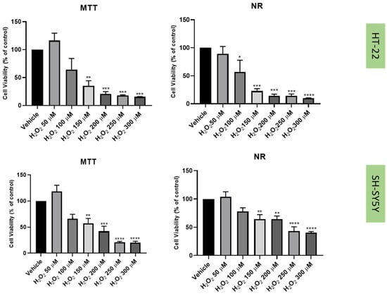 HT-22 and SH-SY5Y viability after incubation of H2O2 (50 µM–300 µM) for 48 h, obtained by MTT (left) and NR (right) assays. The results represent the mean ± SEM of 3–6 independent assays (%). Statistical significance at * p < 0.05, ** p < 0.01, *** p < 0.001 and **** p < 0.0001 vs. vehicle.