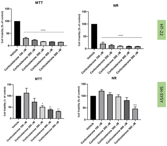 HT-22 and SH-SY5Y viability after incubation of corticosterone (100 µM–500 µM) for 48 h, obtained by MTT (left) and NR (right) assays. The results represent the mean ± SEM of 3–6 independent assays. Statistical significance at * p < 0.05, ** p < 0.01, *** p < 0.001 and **** p < 0.0001 vs. vehicle.