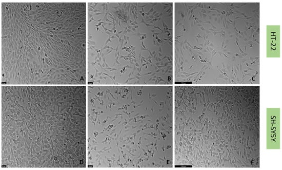 HT-22 and SH-SY5Y morphology after 48 h-incubation of (A,D) vehicle, (B,E) H2O2 105 µM and 132 µM, respectively, and (C,F) corticosterone 35 µM and 322 µM, respectively (100× total magnification). Scale bar: 50 µm (A,B,D,E) and 179.3 µm (C,F).