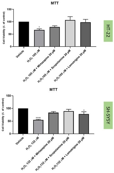 HT-22 and SH-SY5Y viability after incubation of H2O2 (105 µM and 132 µM) combined with mirtazapine, scopolamine, and lamotrigine (20 µM) for 48 h, obtained by MTT assay. The results represent the mean ± SEM of 3–6 independent assays. Statistical significance at * p < 0.05, and **** p < 0.0001 vs. vehicle.