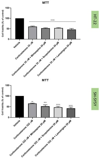 HT-22 and SH-SY5Y viability after incubation of corticosterone (35 µM and 322 µM) combined with mirtazapine, scopolamine, and lamotrigine (20 µM) for 48 h, obtained by MTT assay. The results represent the mean ± SEM of 3–6 independent assays. Statistical significance at ** p < 0.01, *** p < 0.001, and **** p < 0.0001 vs. vehicle.