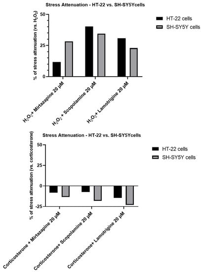 Comparison between the attenuation of H2O2 and corticosterone-induced stress by mirtazapine, scopolamine, and lamotrigine, in HT-22 and SH-SY5Y cells. The results represent the % of stress attenuation of H2O2/corticosterone (IC50 values for each cell line) combined with mirtazapine, scopolamine, and lamotrigine (20 µM) in comparison with H2O2/corticosterone alone (IC50 values for each cell line).