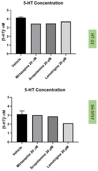 The three drugs that interact with 5-HT3 receptor (mirtazapine, scopolamine, and lamotrigine), in all the tested concentrations, did not lead to cell damage/toxicity, revealing to be good stress reversers in these concentrations. These observations are in concordance with some of the literature, which reports the potential of these drugs to be used in the therapy of depression [,,], as described in the Introduction section. Additionally, HPLC results for these drugs demonstrated that they do not substantially affect 5-HT levels on the extracellular medium, compared to the vehicle, for both cell lines. An exception can be observed with the decreased levels of 5-HT after the application of lamotrigine 20 µM, for SH-SY5Y cells. A hypothesis is that this drug may alter 5-HT levels intracellularly.