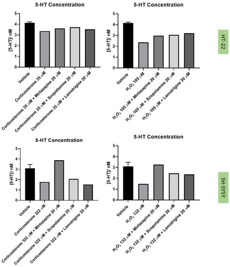Concentrations of 5-HT (nM) in the extracellular medium of HT-22 cells (above) and SH-SY5Y cells (below) treated with corticosterone, H2O2, and their combinations with mirtazapine, scopolamine, and lamotrigine, determined by HPLC.
